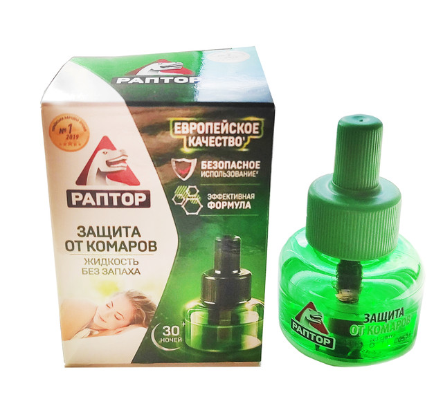 Рідина від комарів Раптор - дієвий засіб для боротьби і знищення комах, що кусають у приміщенні. Флакон розрахований на 30 ночей спокійного сну без укусів і нав'язливого писку. Не має запаху, тому рекомендовано тим, хто не переносить ароматизатори у складі.