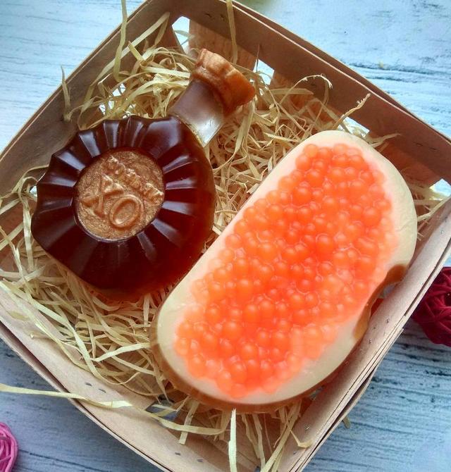 Яскраве мило, що запам'ятовується, для чоловіка. До набору входить "Коньяк" (70 г) і "Бутерброд із червоною ікрою" (100г) .